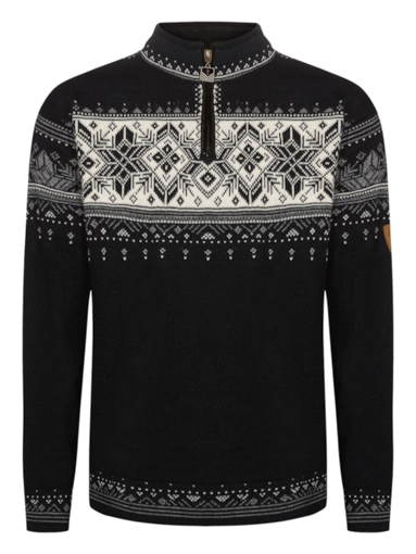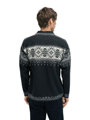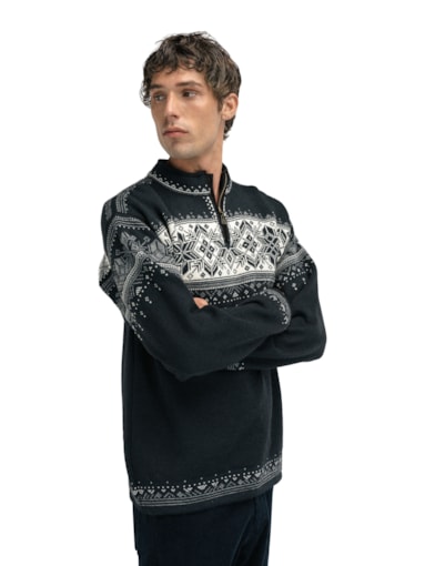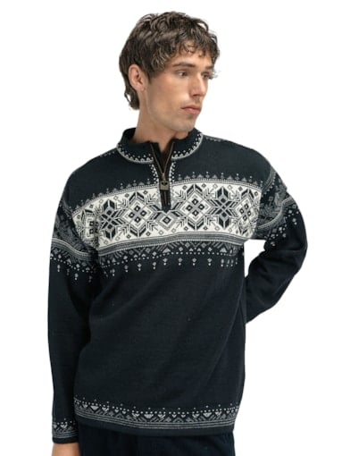 The Blyfjell is a best-selling men's sweater rooted in timeless Norwegian tradition. Made from 100% lightweight wool, it offers natural warmth and comfort while featuring a quarter-zip neckline with a fleece-lined collar for added softness. The intricate design showcases classic Norwegian folk patterns, including variations of the iconic eight-petal rose – a symbol of Norwegian heritage and artistry. -