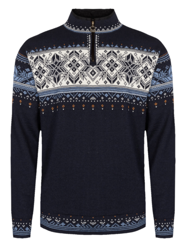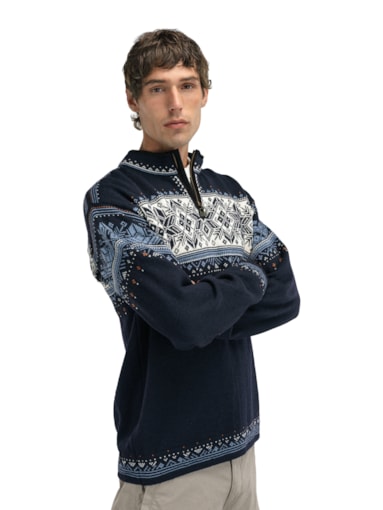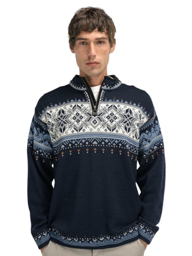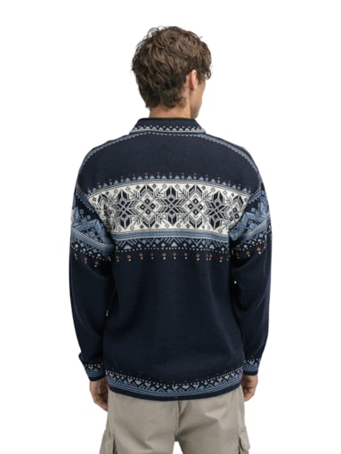 The Blyfjell is a best-selling men's sweater rooted in timeless Norwegian tradition. Made from 100% lightweight wool, it offers natural warmth and comfort while featuring a quarter-zip neckline with a fleece-lined collar for added softness. The intricate design showcases classic Norwegian folk patterns, including variations of the iconic eight-petal rose – a symbol of Norwegian heritage and artistry. -