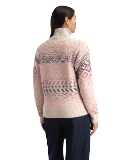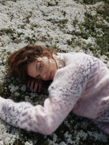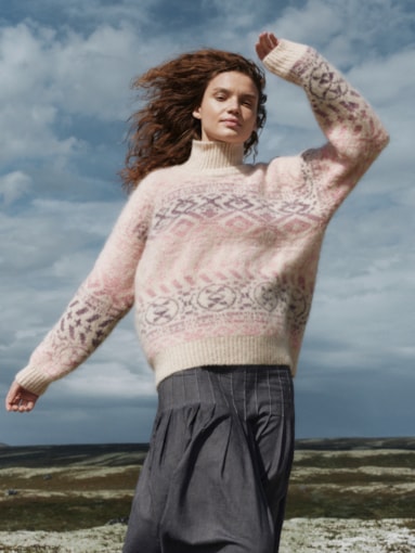 With a relaxed fit and a high neck, the Highland sweater delivers a bold, soft, and strikingly patterned style. There is playfulness in both the color choices and the textures. The airy and luxurious alpaca yarn forms a solid base. The pattern is knitted in a cotton yarn with an ombré effect, where each cotton thread has graduated colors. This yarn also has a flatter structure. Together, this creates both contrast and depth, making it a sweater that truly stands out.