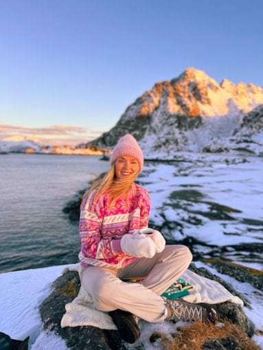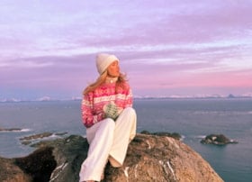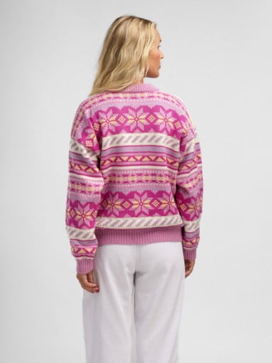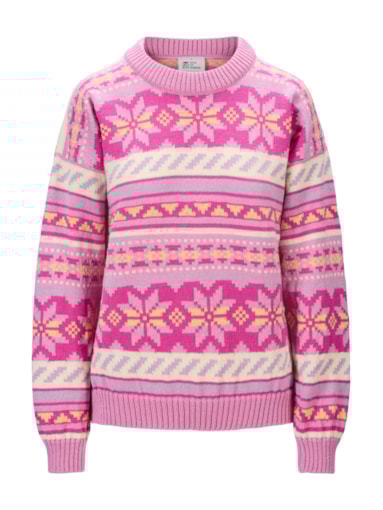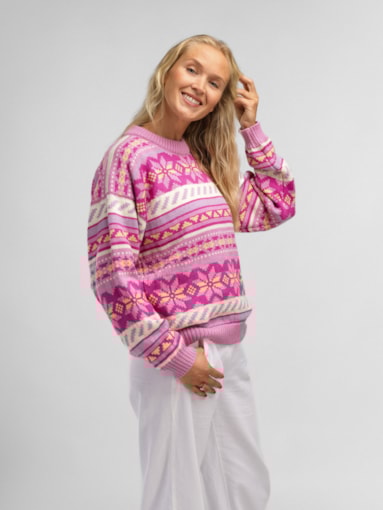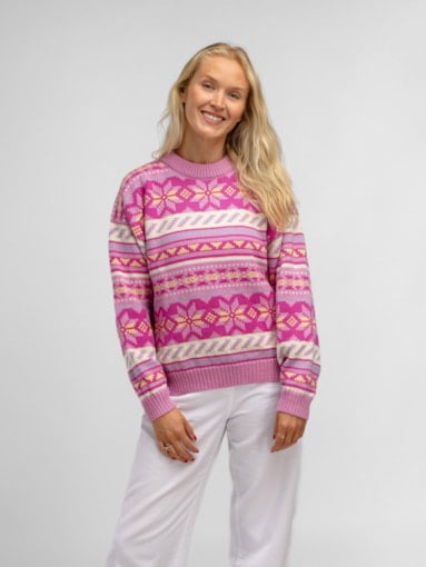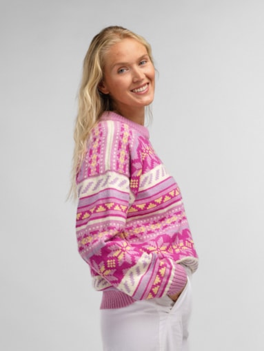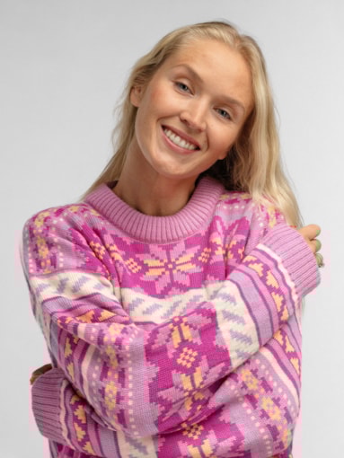 • A new colorful Ingrid sweater. Inspired by classical designs from the 80s and 90s, the Ingrid sweater is a whimsical and fun patterned creation. Made with 100% long-lasting wool this sweater is co-developed with the outdoorsy Norwegian influencer Ingrid Raadim Hennig. Being an experienced Lofoten nomad, we have continued our collaboration to develop a new, light, and comfortable sweater reflecting the natural pastels found in these incredible surroundings. Ingrid is a huge vintage enthusiast, and you can find many iconic Dale of Norway sweaters in her closet. The design includes the distinctive eight-pedal rose and Dale of Norway’s pattern from our popular Bjorøy sweater. Merged with other elements from our archive’s we have created a new & playful design.