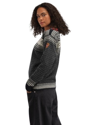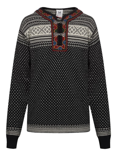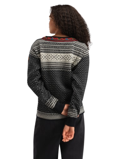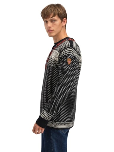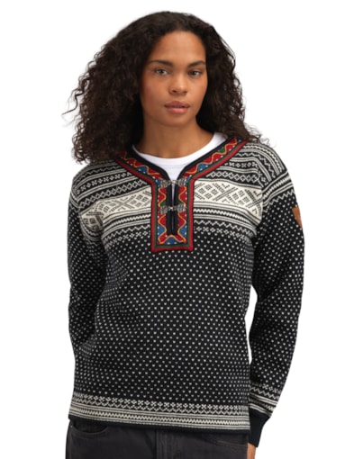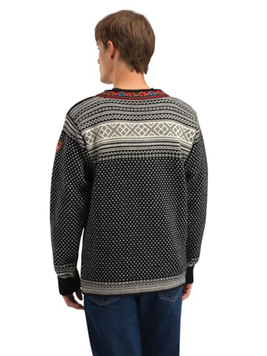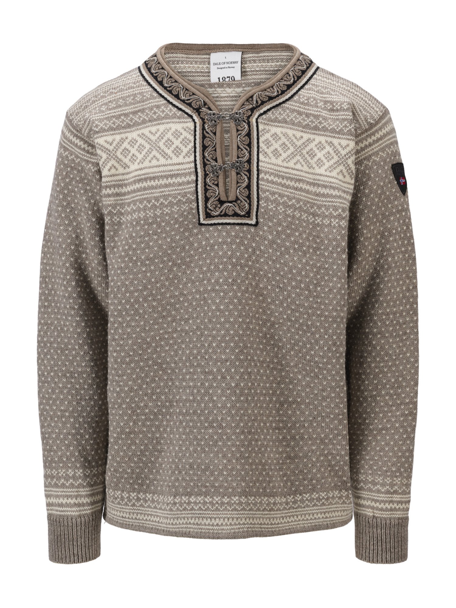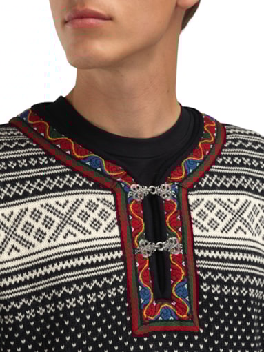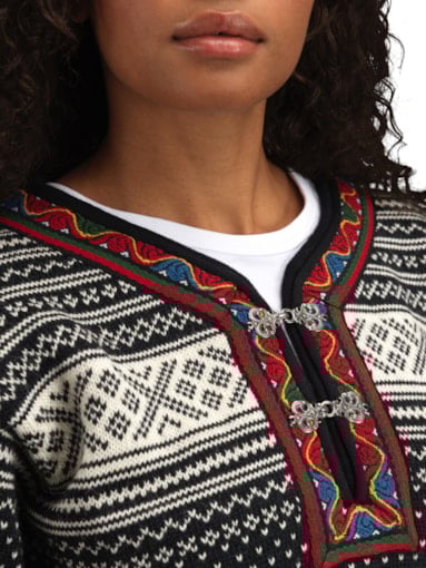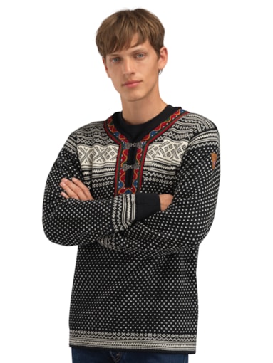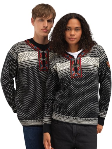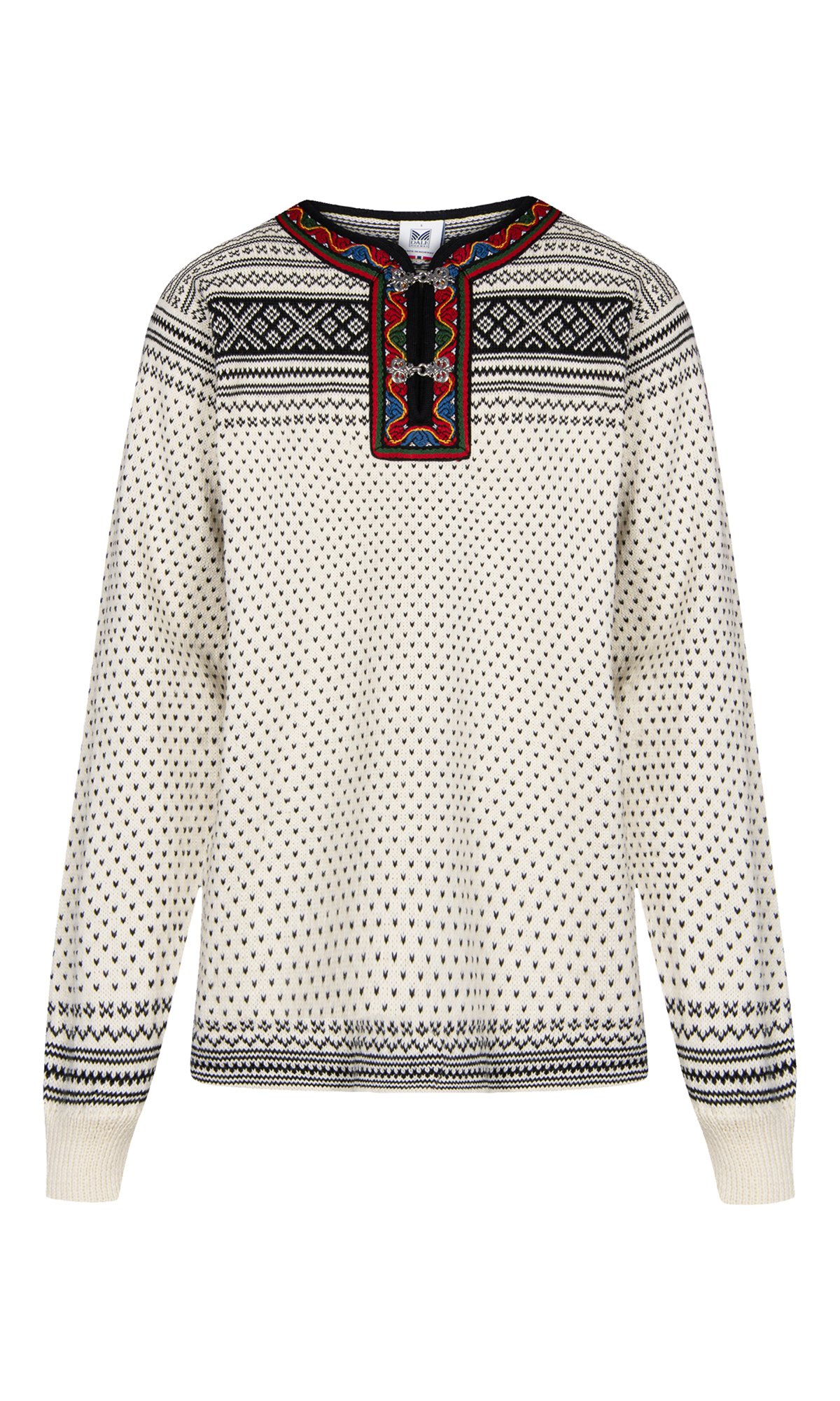 The Setesdal design is Norway’s most famous pattern. This is the original "lusekofte," knitted in 100% Norwegian wool, with Norwegian-made pewter clasps and woven bands, identical to the original design. The wool sweater features the well-known "luse" pattern and traditional crosses, which were originally knitted in to protect against evil spirits.