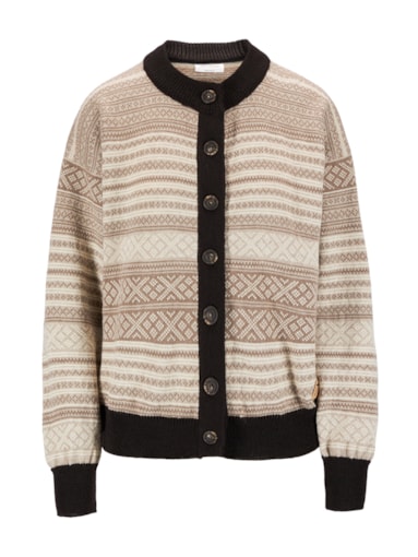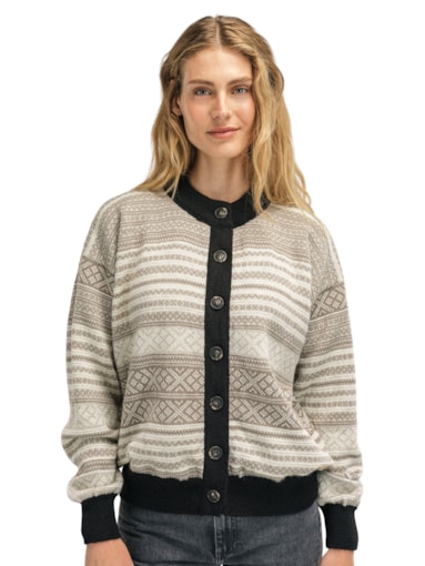 • A fresh reinterpretation of the classic Setesdal jacket. The cardigan’s design plays with the Setesdal pattern and is offset by contrast-colored sleeves, bottom hem and button placket. The wool cardigan has a center front button closure, dropped shoulders creating a relaxed fit. Skarpøy is knitted in 100% long-lasting wool and has buttons made from 50% recycled paper.