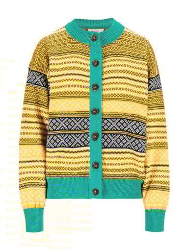 • A fresh reinterpretation of the classic Setesdal jacket. The cardigan’s design plays with the Setesdal pattern and is offset by contrast-colored sleeves, bottom hem and button placket. The wool cardigan has a center front button closure, dropped shoulders creating a relaxed fit. Skarpøy is knitted in 100% long-lasting wool and has buttons made from 50% recycled paper.