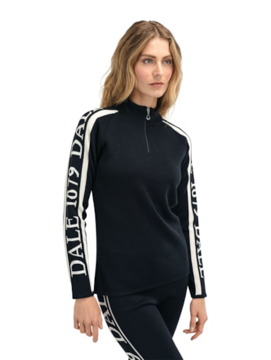 • A soft and sporty sweater with clean lines and a semi-high neck with zipper. Double layers of soft merino wool knitted together with a flexible thread provide a pleasant stretch effect and a highly durable fit. This mid-layer sweater can also be used as a next-to-skin sweater.The text "Dale 1879" are boldly knitted into the sleeves overarm. 1879 refers to the year our adventure started.