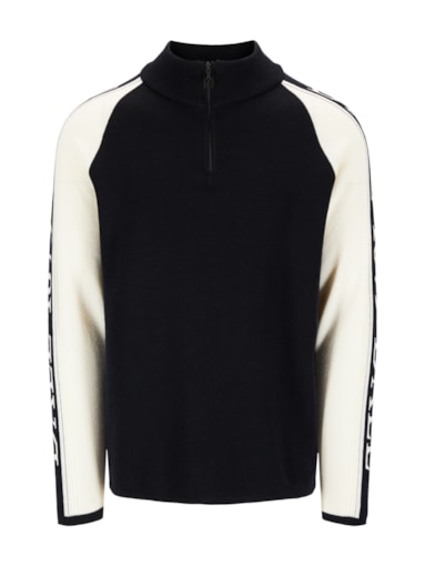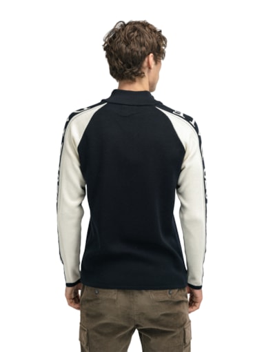 • A soft and sporty sweater with contrast-colored sleeves, clean lines and a semi-high neck with a zipper. Double layers of soft merino wool knitted together with a flexible thread provide a pleasant stretch effect and a highly durable fit. This mid layer sweater can also be used as a next-to-skin sweater. This mid-layer sweater can also be used as a next-to-skin sweater. The text "Dale 1879" are boldly knitted into the sleeves overarm. 1879 refers to the year our adventure started.