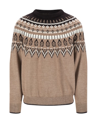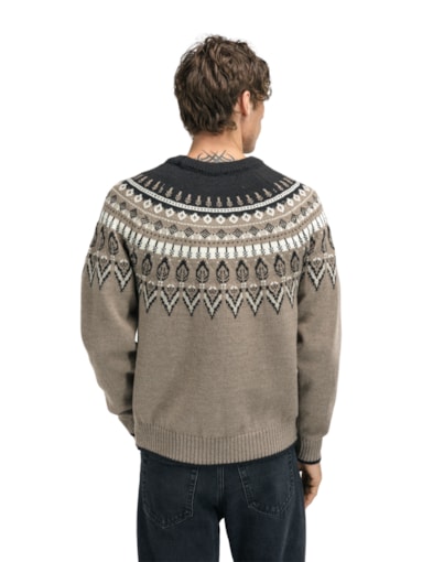 A heavy, patterned wool sweater with a relaxed fit. The sweater is designed to look like a round-knit sweater, but has a classic construction with raglan sleeves. Sula is a thick and comfortable sweater knitted in 100% long-lasting wool.