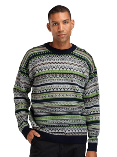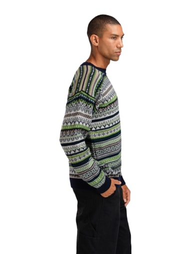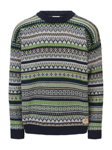 A playful, detailed and fully patterned wool sweater with a relaxed fit and round neck. The sweater is knitted in 100% long-lasting wool. The pattern is a mix of historical Dale patterns.