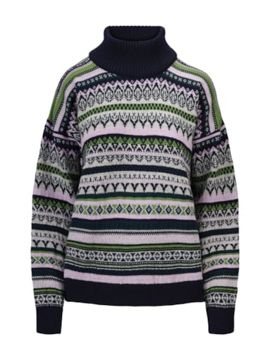 • A playful, detailed and fully patterned wool sweater with dropped shoulders and a high neck. Utsira has a wide silhuette with smaller rib endings at the sleeves and hem, giving the sweater a relaxed and oversized fit. The sweater is knitted in 100% longasting wool. The pattern is a mix of historical Dale patterns.