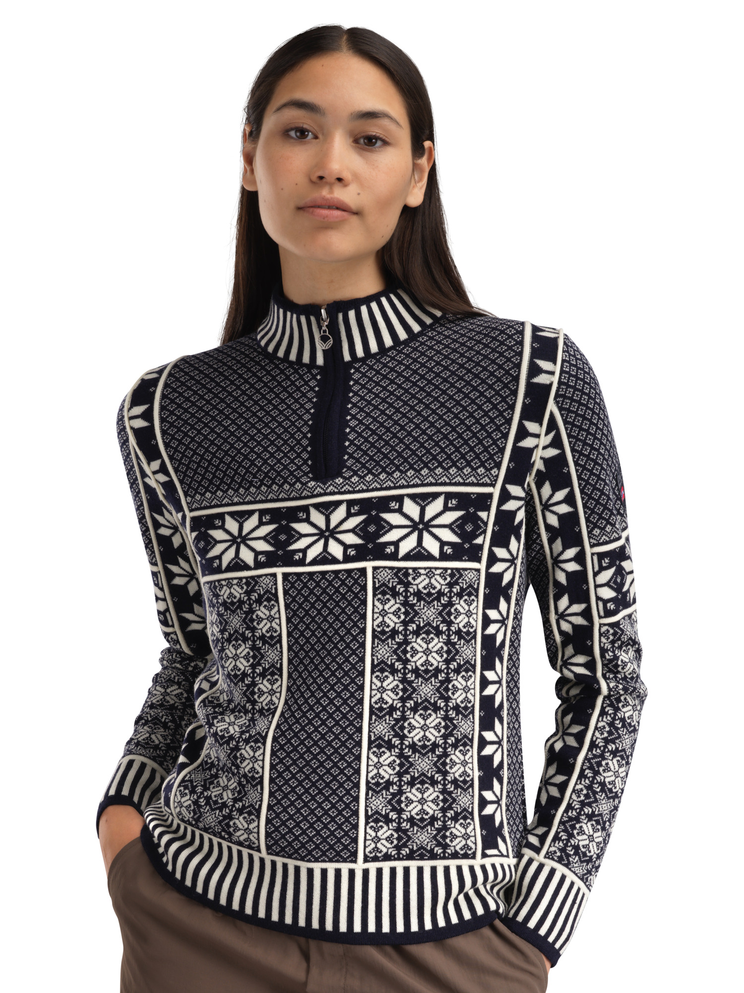 Inspired by Dale of Norway’s rich archive, the design reinterprets classic Norwegian patterns, including the eight-petal rose, traditional lice patterns, and heritage borders. Embossed linear detailing adds texture and depth, giving the pullover a contemporary Scandinavian character. The quarter-zip neckline allows for easy layering, while the flatbed knit ensures a clean finish inside and out. Rooted in tradition yet shaped for today, Vardåsen women’s sweater is a confident expression of Norwegian knitwear heritage in a modern form.
