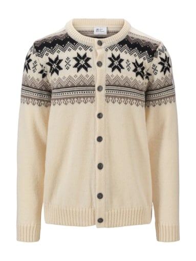 A classic, retro wool jacket with detailed patterns reminiscing back to the 1950s and 60s. The jacket has a front button closure with Norwegian-made pewter buttons. The Veafjord is knitted in 100% long-lasting Norwegian wool, making the wool jacket extra warm and durable.
