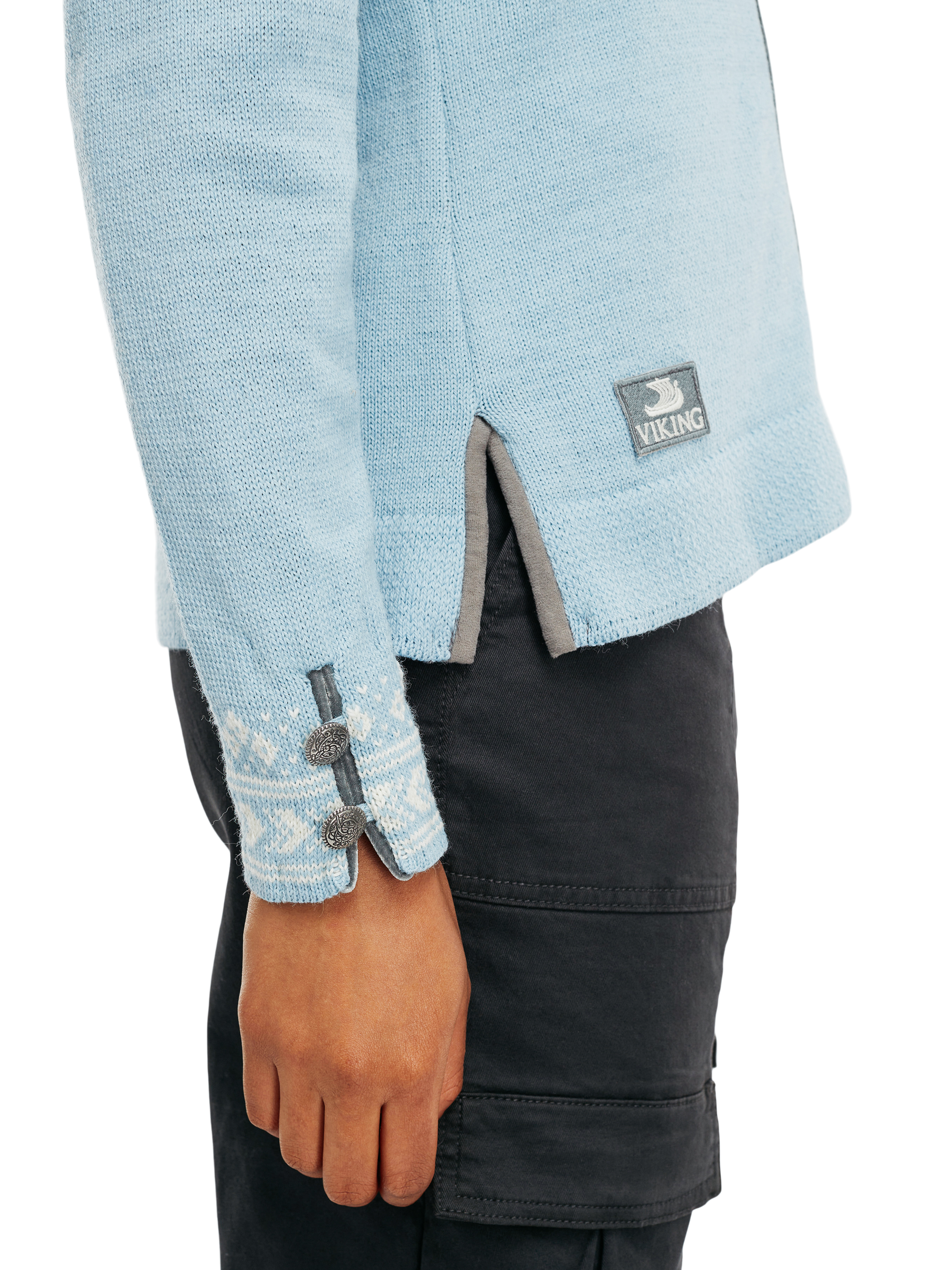 Our Viking Karine sweater comes in navy and a light blue version. Made of the finest, durable, 100% lightweight wool, inspired by the textile of the Osebergship, with a zipper pull fashioned after a Viking Age brooch c. 800 - 1050 AD with a Urnes-style motif.