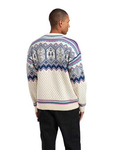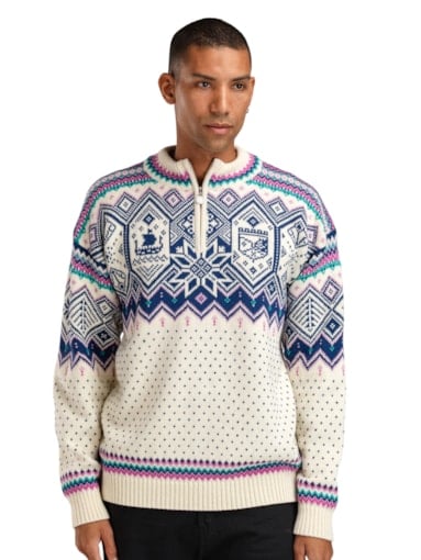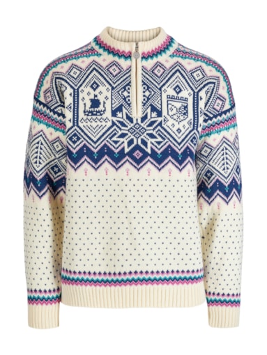 This is the official sweater for the 2025 Ski World Championships in Trondheim. A warm and comfortable wool sweater with a distinct retro touch, blending fresh colors with a classic expression. The pattern is inspired by the championship's values of diversity and inclusion, while drawing motifs from historical cultural landmarks in Trondheim. The sweater is knitted in 100% wool for long-lasting qualities and features a medium-high neck with a zipper.